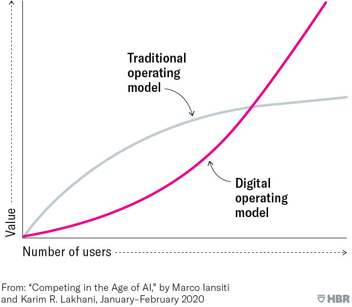 “The most important value creation dynamic of a digital operating model is its network effects. The basic definition of a network effect is that the underlying value or utility of a product or service increases as the number of users utilizing the service increases.”