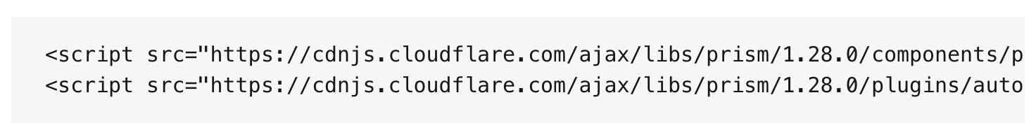 <script src="https://cdnjs.cloudflare.com/ajax/libs/prism/1.28.0/plugins/autoloader/prism-autoloader.min.js" integrity="sha512-fTl/qcO1VgvKtOMApX2PdZzkziyr2stM65GYPLGuYMnuMm1z2JLJG6XVU7C/mR+E7xBUqCivykuhlzfqxXBXbg==" crossorigin="anonymous" referrerpolicy="no-referrer"></script>