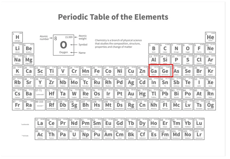 This discovery went on to become the Periodic Law, an early version of the periodic table of elements. Amazingly, his new framework for organizing the elements allowed him to correct the properties of some already known elements and predict the properties of eight, which were yet to be discovered! People mocked him at first and called him crazy, but he was so confident in his structure that he even left missing spaces in his table for some yet to be discovered elements. He was vindicated when gallium (Ga) and germanium (Ge) were discovered in 1875 and 1886, respectively, and fit perfectly into the two empty slots he left for them [Figure 1].