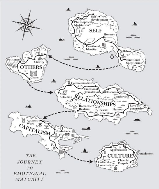 “Unfortunately, we don’t necessarily always tell our partner that we are causing problems because we are sad about things that have nothing to do with them; we just create arguments to alleviate our distress – we are mean to them because our boss didn’t care, the economy wasn’t available for a chat and there was no God to implore. We reroute all the humiliation and rage that no one else had time for on to the shoulders of the one person who most cares about our well-being. We tell them that if only they “were more supportive, were less intrusive, made more money, were less materialistic, were more imaginative or less naive, less fussy or more demanding, more dynamic or more relaxed, sexier or less obsessed with sex, more intelligent or less wrapped up in the world of books, more adventurous or more settled … then we could be happy – our life would be soothed and our errors redeemed. It is, as we imply and occasionally even tell them, all their fault. This is, of course, horrible and largely untrue."